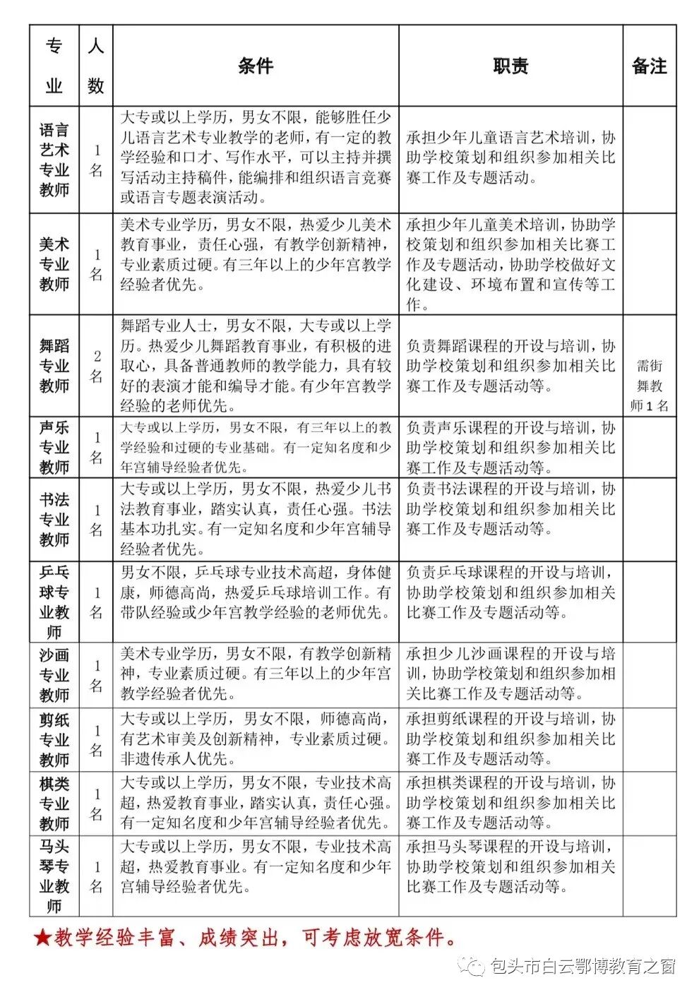 白云鄂博矿区中小学综合实践学校是白云鄂博矿区唯一一所集中小学课后艺体特长培养、综合实践教育、初高中通用技术教学、研学旅行于一体的综合性实践学校。学校目前共开设8个艺体特长培训班,服务全区近1000余名中小学生。在国家“双减”政策背景下,为切实减轻家长负担,打造服务于白云区中小学生的公益普惠性课后服务体系,区中小学综合实践学校艺体培训项目及班额需进行进一步扩充,需向社会公开招聘部分艺体特长专业教师。
