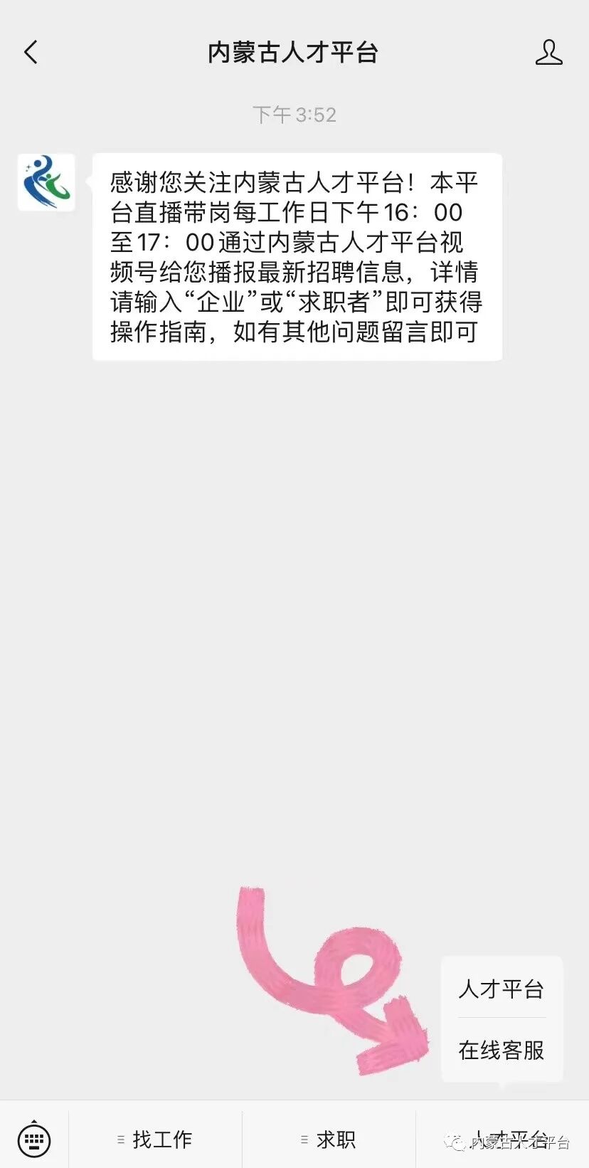 6、操作过程中遇到问题可搜索“内蒙古人才平台”公众号,关注后点击在线客服,并在工作日8:30-17:30咨询客服。